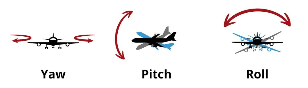 Though this is useful for solving math problems, it misses the real world of movement through space which includes rotational movement of objects. A useful model is to imagine a plane in the air. Obviously, the plane can move up-down, left-right, and forward-backward. These are the three degrees of freedom we first introduced to describe the plane’s position in the three-dimensional space of the atmosphere. However, the plane can also rotate along three axes. To describe those motions, we introduce three additional degrees of freedom. Rolling left-right around an imaginary line aligned with the plane’s forward motion is call “roll”. Swaying left-right is called yaw and the up-down movement of the nose is known as pitch. Describing these six degrees of freedom can completely describe the movement of an object moving through space.
